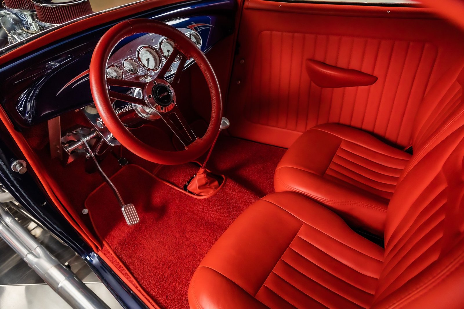 Inside, the red interior adds bold contrast and a refined touch. Modern gauges, power windows, tilt steering, and quality hardware create a cockpit that’s both comfortable and functional without losing the raw appeal of a traditional hot rod. Built to be driven and enjoyed, this 3-window coupe captures the spirit of classic hot rodding with modern reliability and performance.
