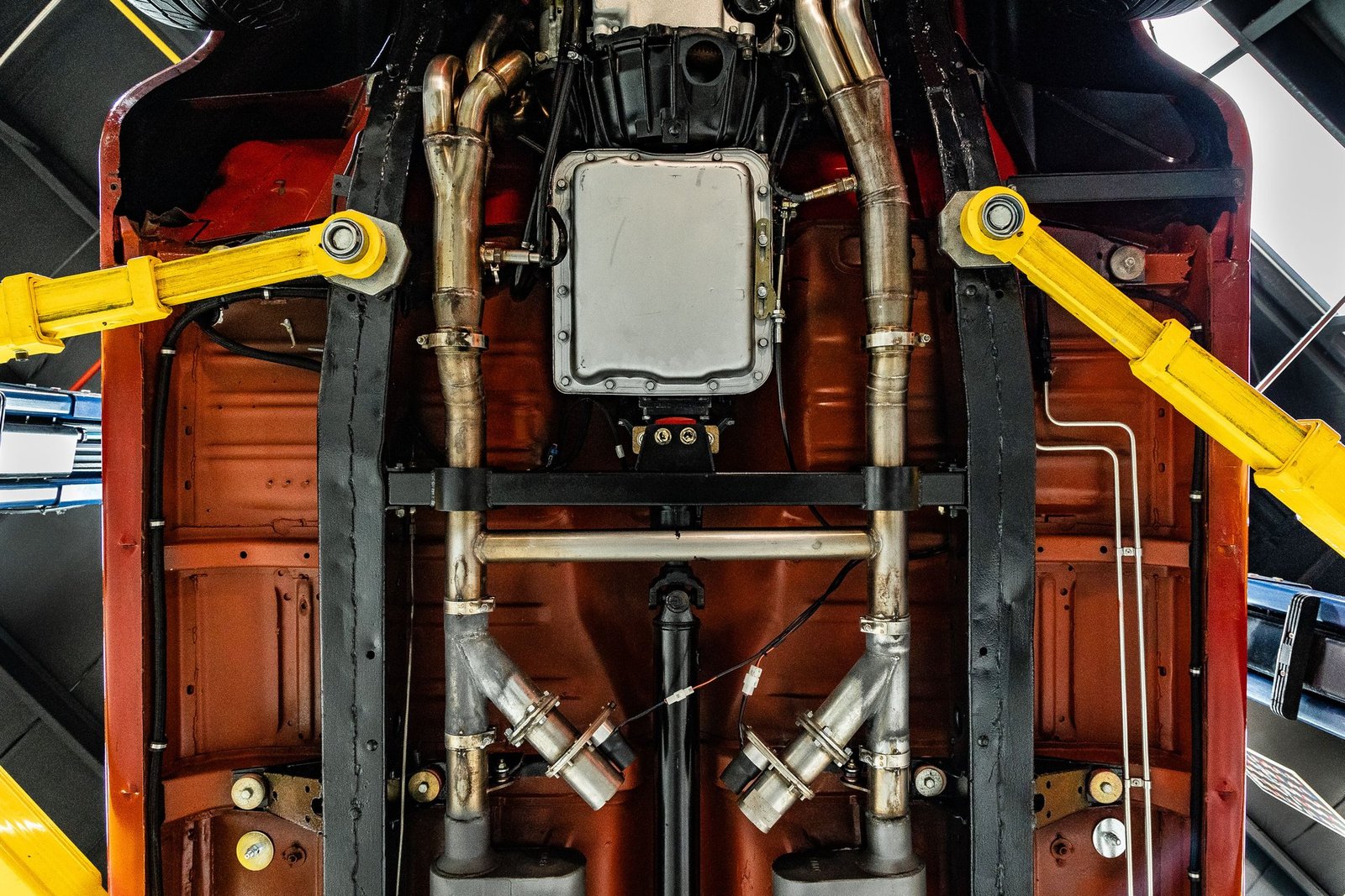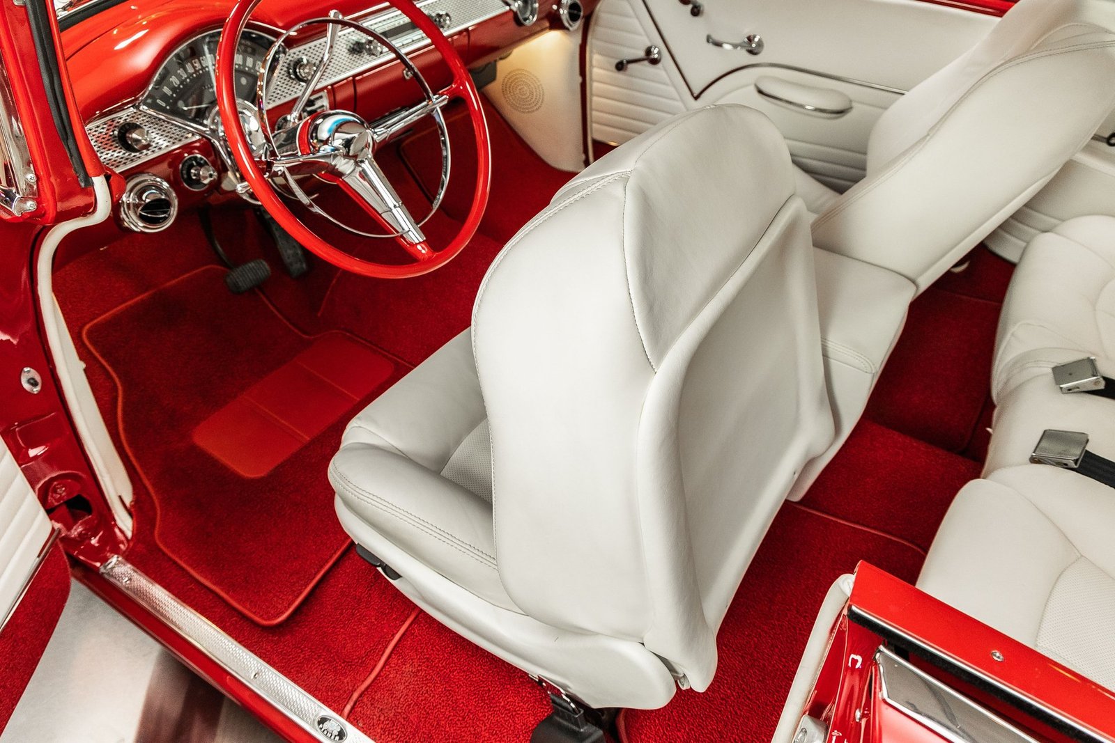 Finished in a striking red and white exterior, the body presents with laser-straight panels and mirror-like paint that highlight the iconic Tri-Five silhouette. Inside, the cabin features custom seating, upgraded interior trim, and thoughtful conveniences that make the car enjoyable for long drives or car show weekends. The fully finished trunk and clean undercarriage further reflect the high level of craftsmanship throughout the build.