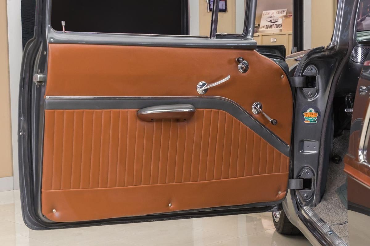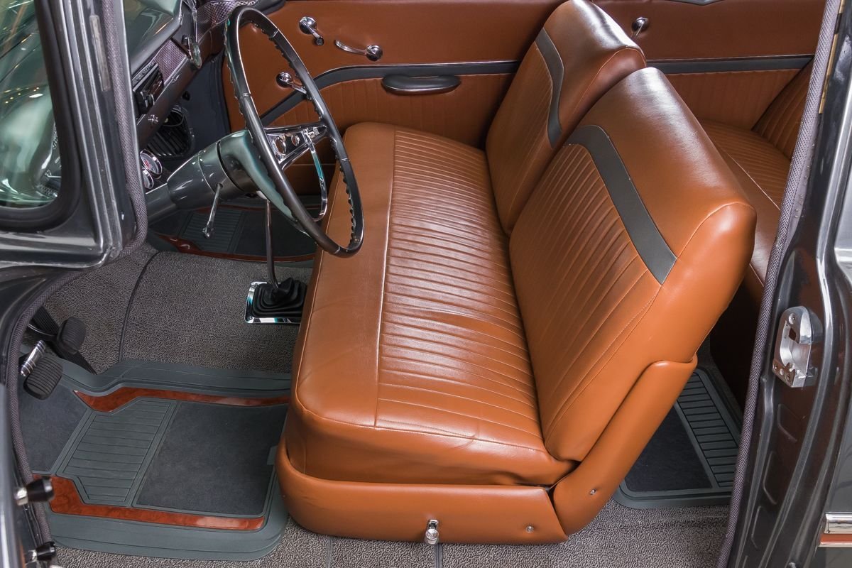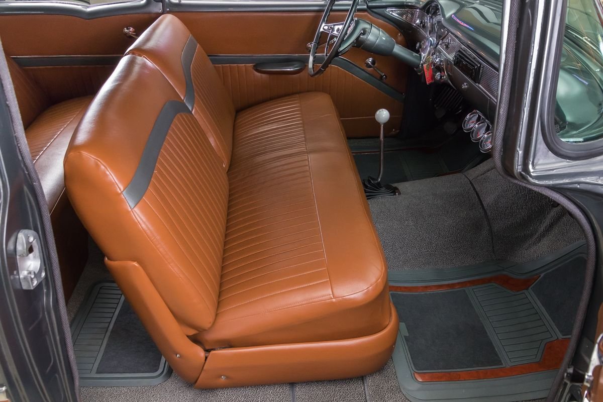 Inside, the cabin offers a tasteful blend of vintage style and restoration-quality refinement. Bench seating upholstered in warm-toned leather complements the exterior color scheme, while the clean dash and traditional layout keep the interior true to its 1950s roots. This Bel Air delivers the look, sound, and feel of a classic American icon, restored to be driven and enjoyed.