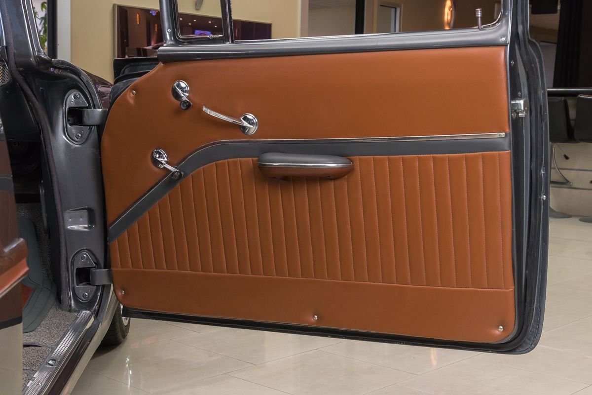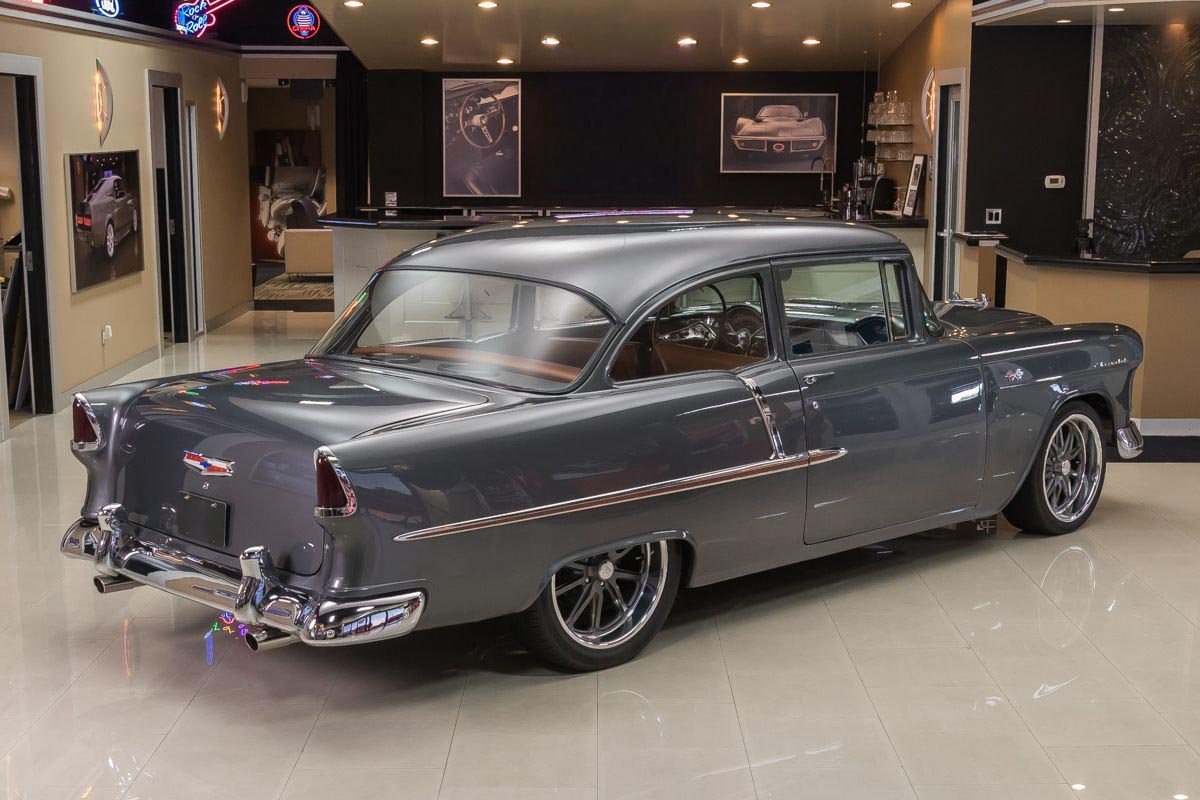 This example has benefited from a complete frame-off, nut-and-bolt rotisserie restoration, resulting in a car that presents beautifully from every angle. With very limited mileage since completion, it retains the fresh, tightly assembled feel enthusiasts look for in a high-quality restoration. Finished in a striking graphite gray, the exterior highlights the Bel Air’s crisp lines and polished trim, while the lowered stance gives it a subtle, modern edge without losing its classic identity.