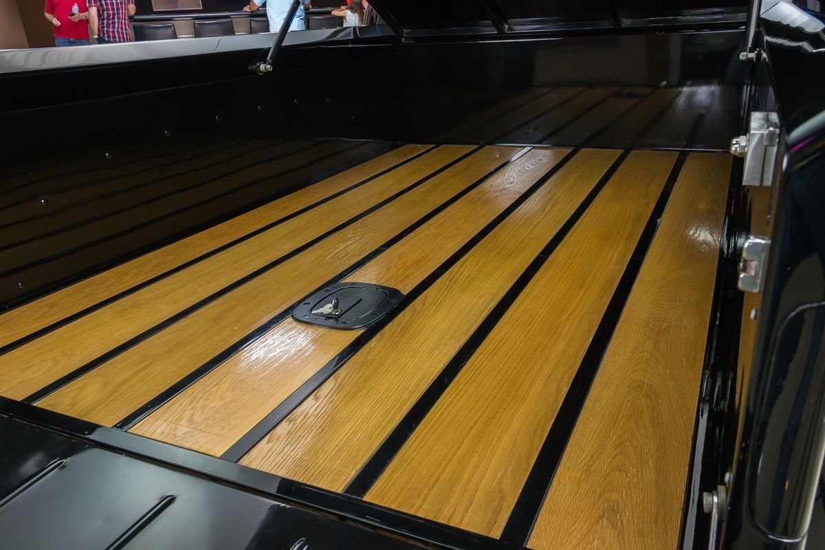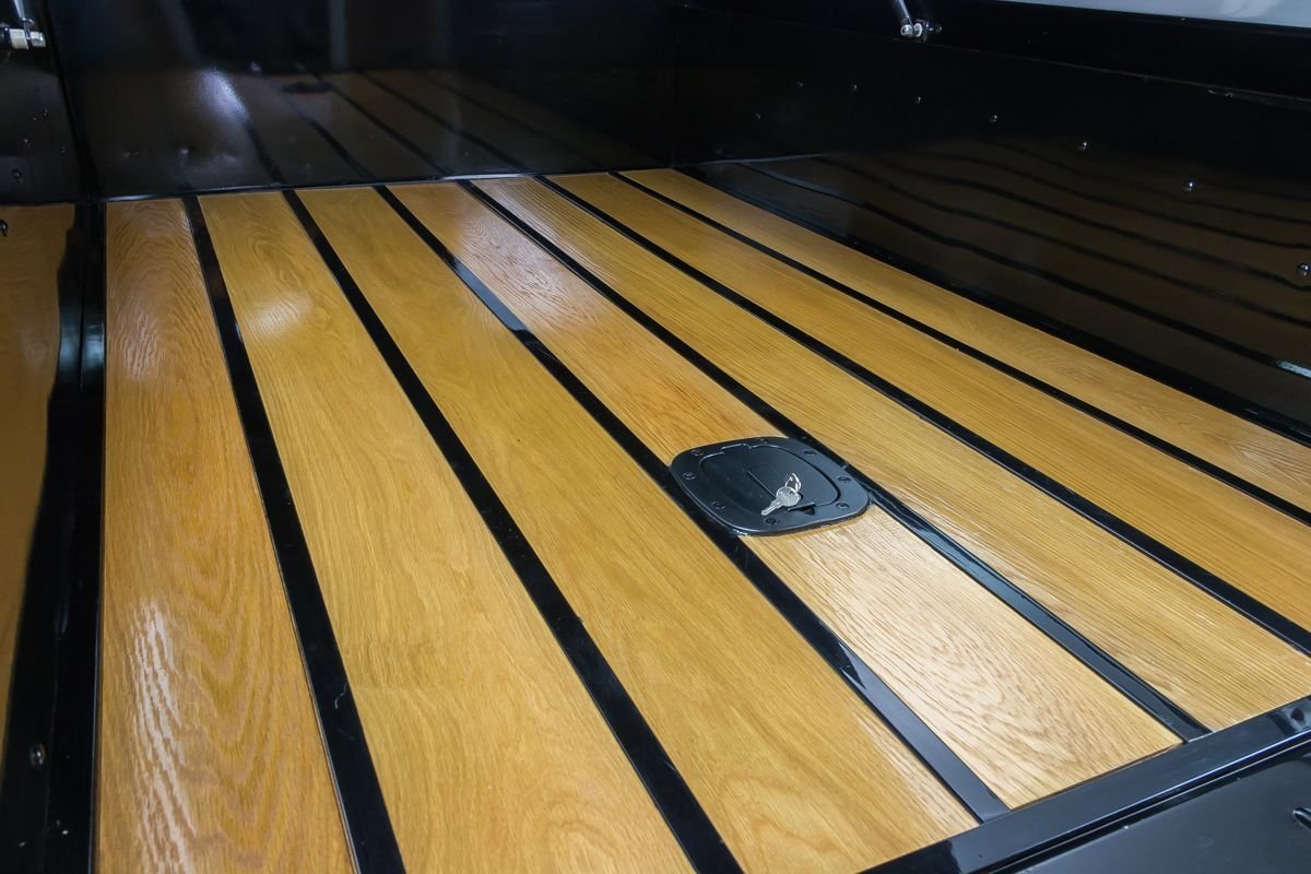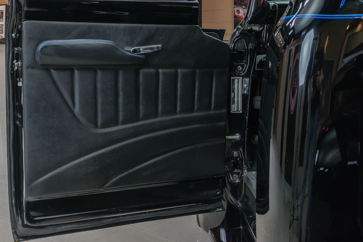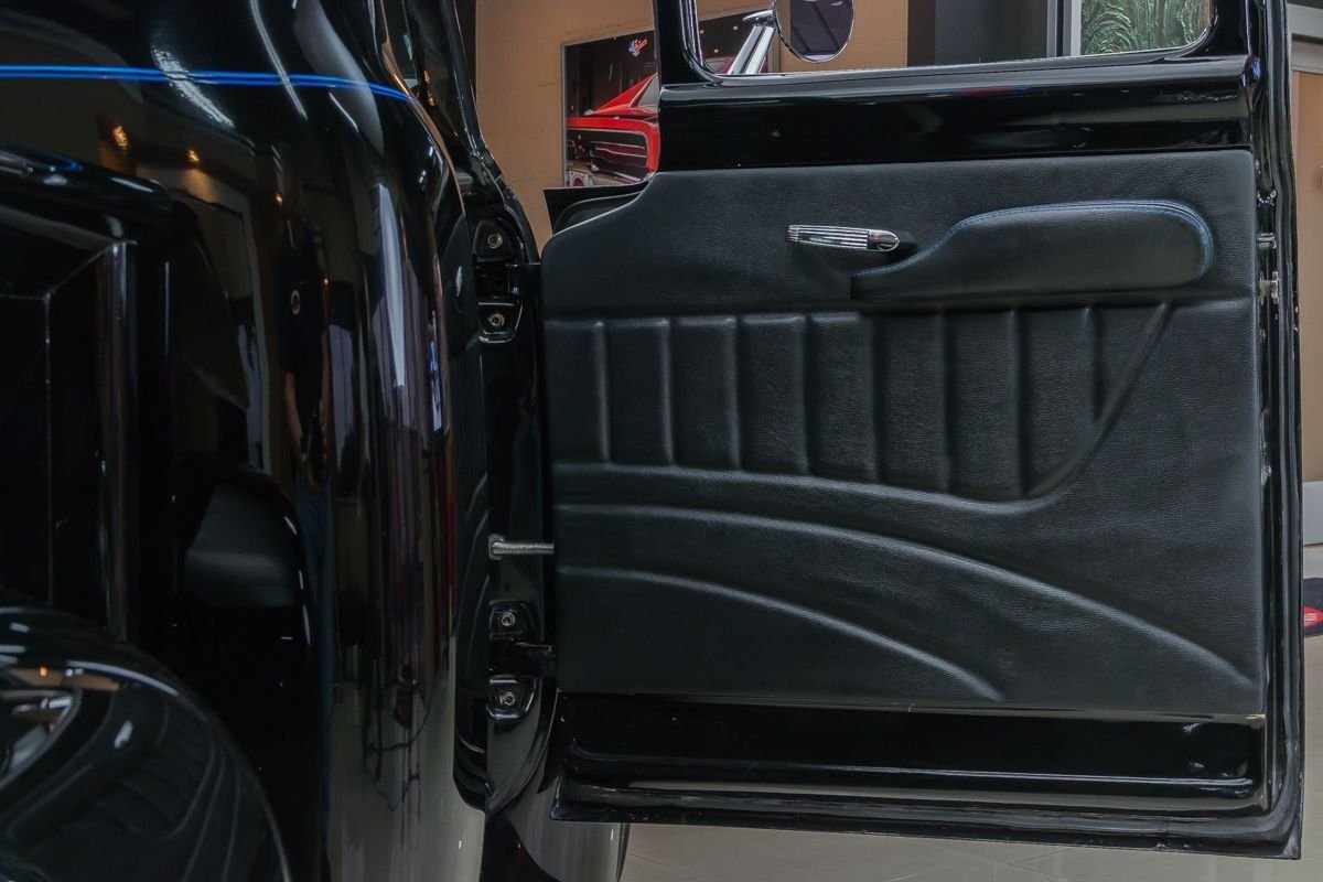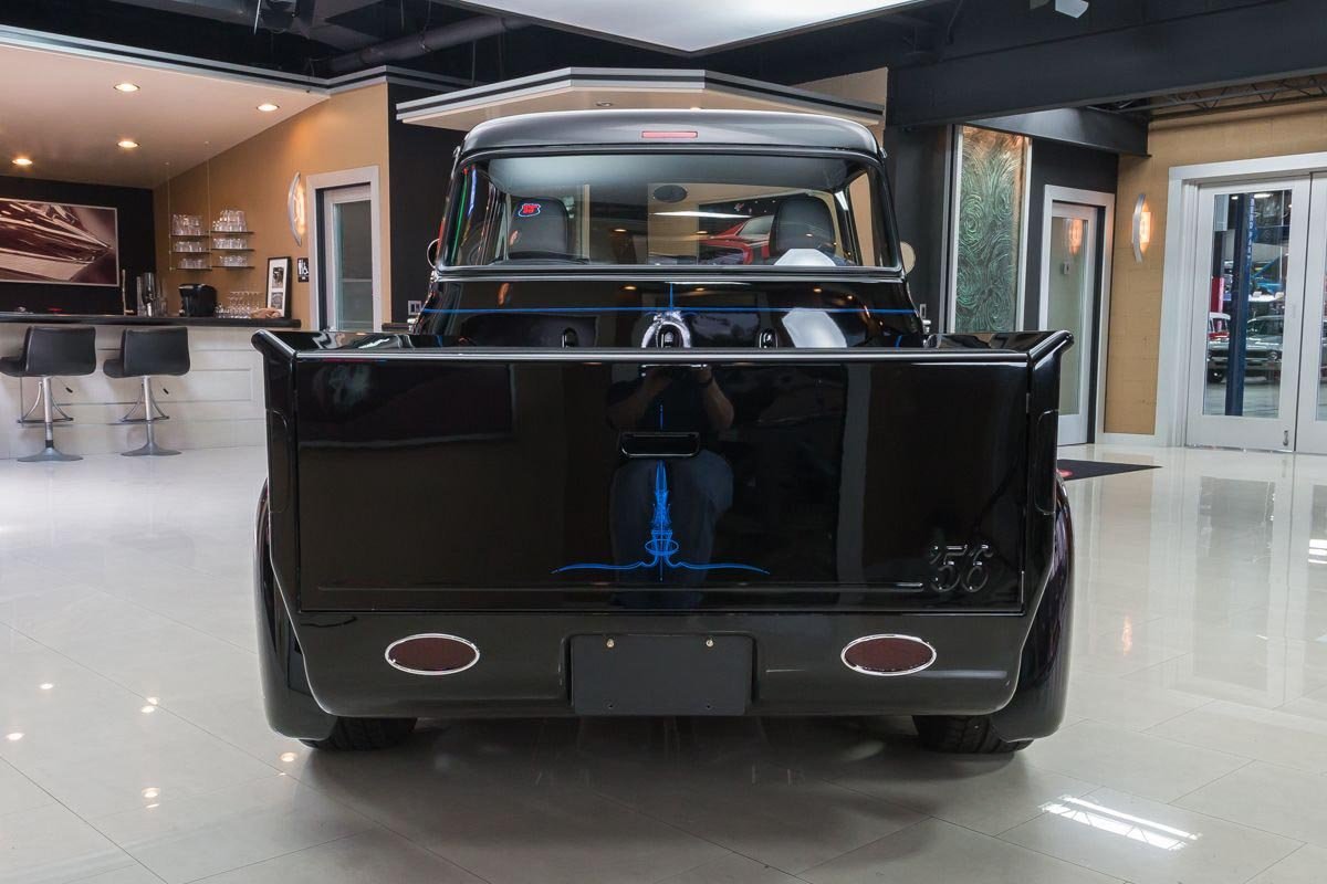 This example is an all-steel truck that has undergone an extensive frame-off, nut-and-bolt build with a strong emphasis on quality, drivability, and subtle customization. Finished in high-gloss black, the body presents with a smooth, refined appearance that highlights the truck’s iconic lines. Thoughtful custom touches—such as the recessed tailgate latch, smoothed roll pan, and oak wood bed—enhance the look without straying from the truck’s classic identity.
