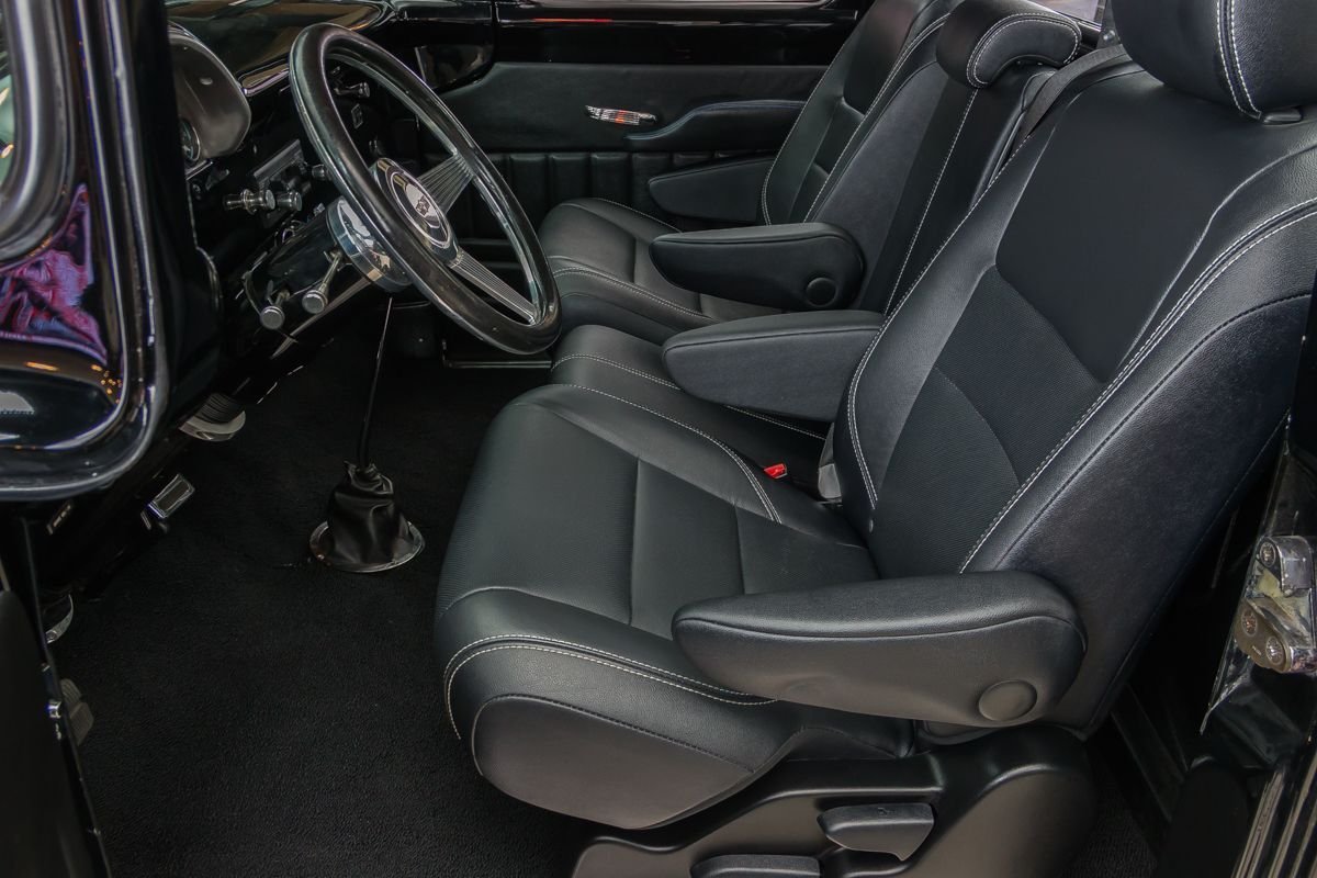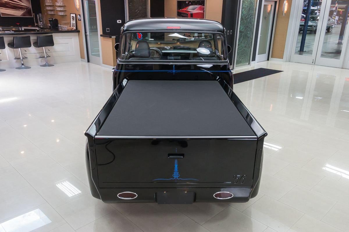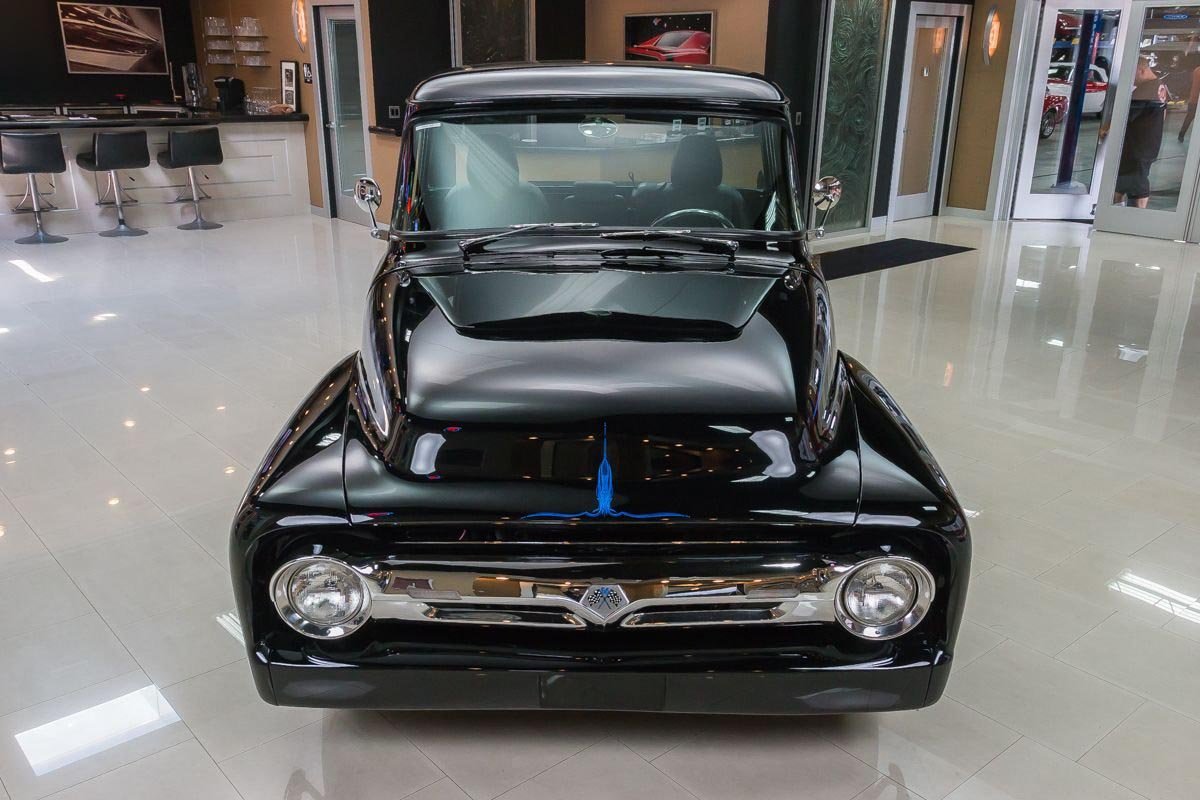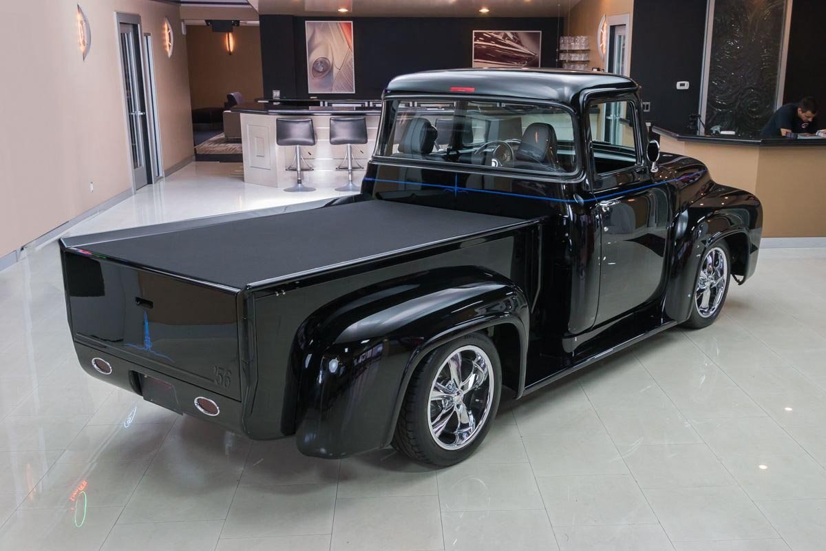 Inside, the cabin has been transformed into a comfortable, well-appointed environment. Leather seating, custom instrumentation, and modern conveniences create a refined interior that complements the truck’s exterior presentation. Altogether, this 1956 F100 Big Window delivers classic Ford truck style backed by modern performance and comfort, making it a standout custom pickup built to be driven and enjoyed.