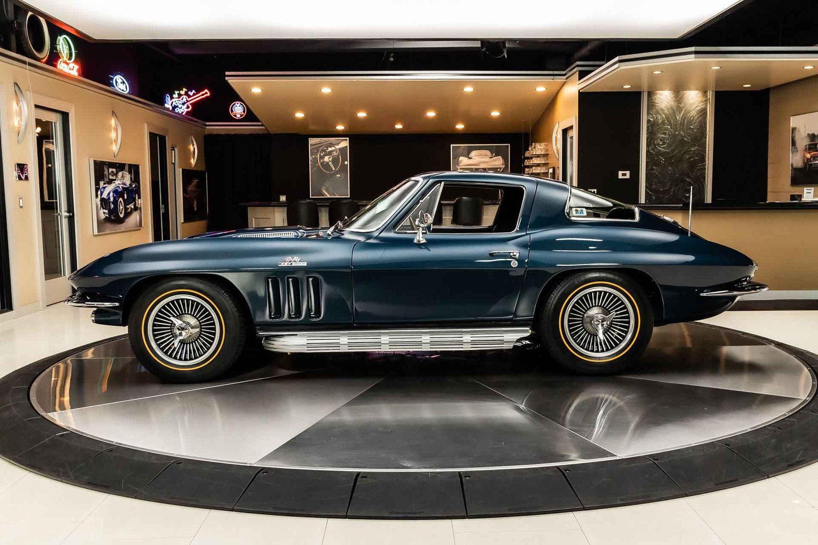 This example has undergone a complete frame-off restoration and stands out as a highly authentic, investment-grade Corvette. Finished in striking Laguna Blue, the coupe presents with crisp lines, excellent fit, and period-correct details throughout. Features such as the bulged hood, flip-up headlights, knock-off wheels, and side exhaust reinforce the unmistakable presence that defines a true big-block mid-year Corvette.