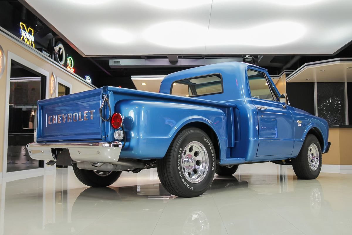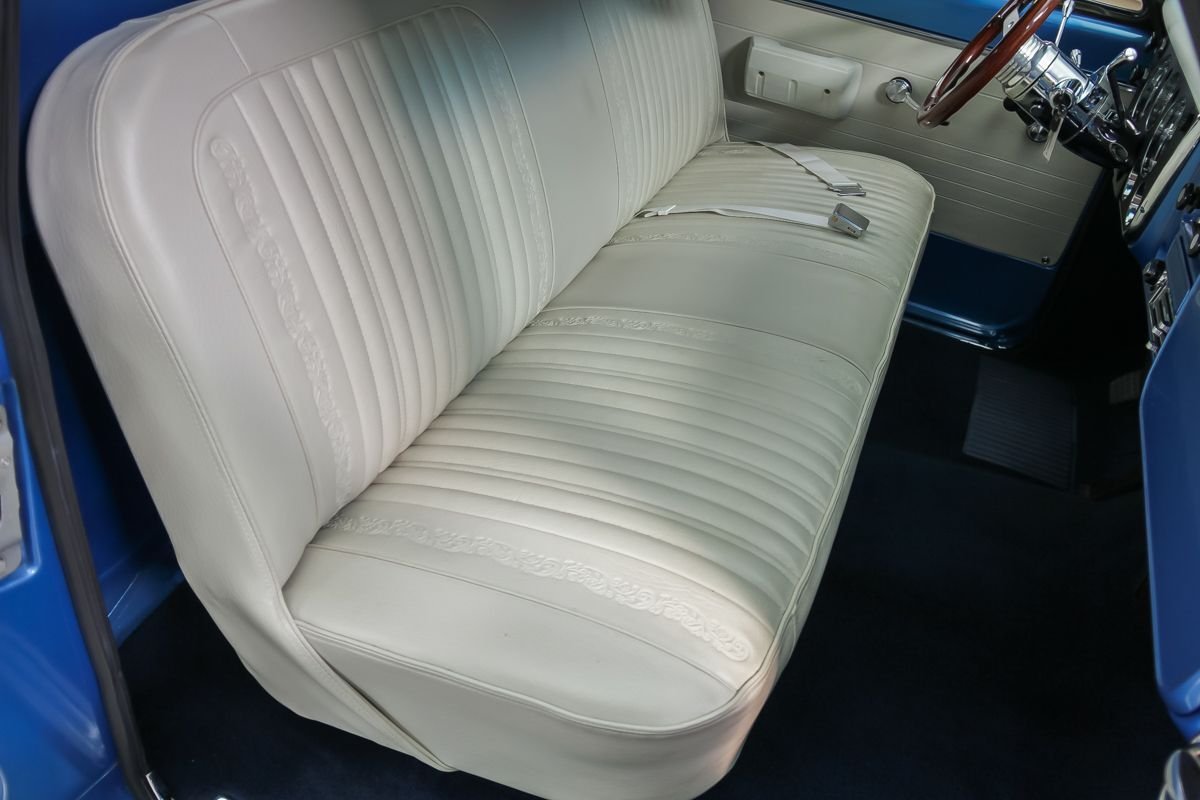 Finished in a medium blue metallic exterior, the truck presents with straight bodywork, excellent trim, and a classic stance. Inside, the white and blue interior closely mirrors the original factory look, featuring restored upholstery, a column shifter, and a clean, detailed dashboard. This C-10 delivers an authentic late-1960s pickup experience, restored to be driven, enjoyed, and proudly shown.