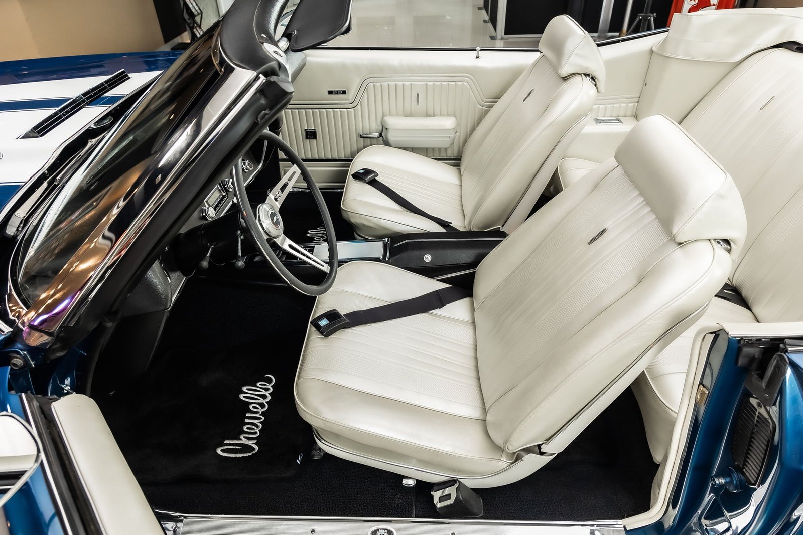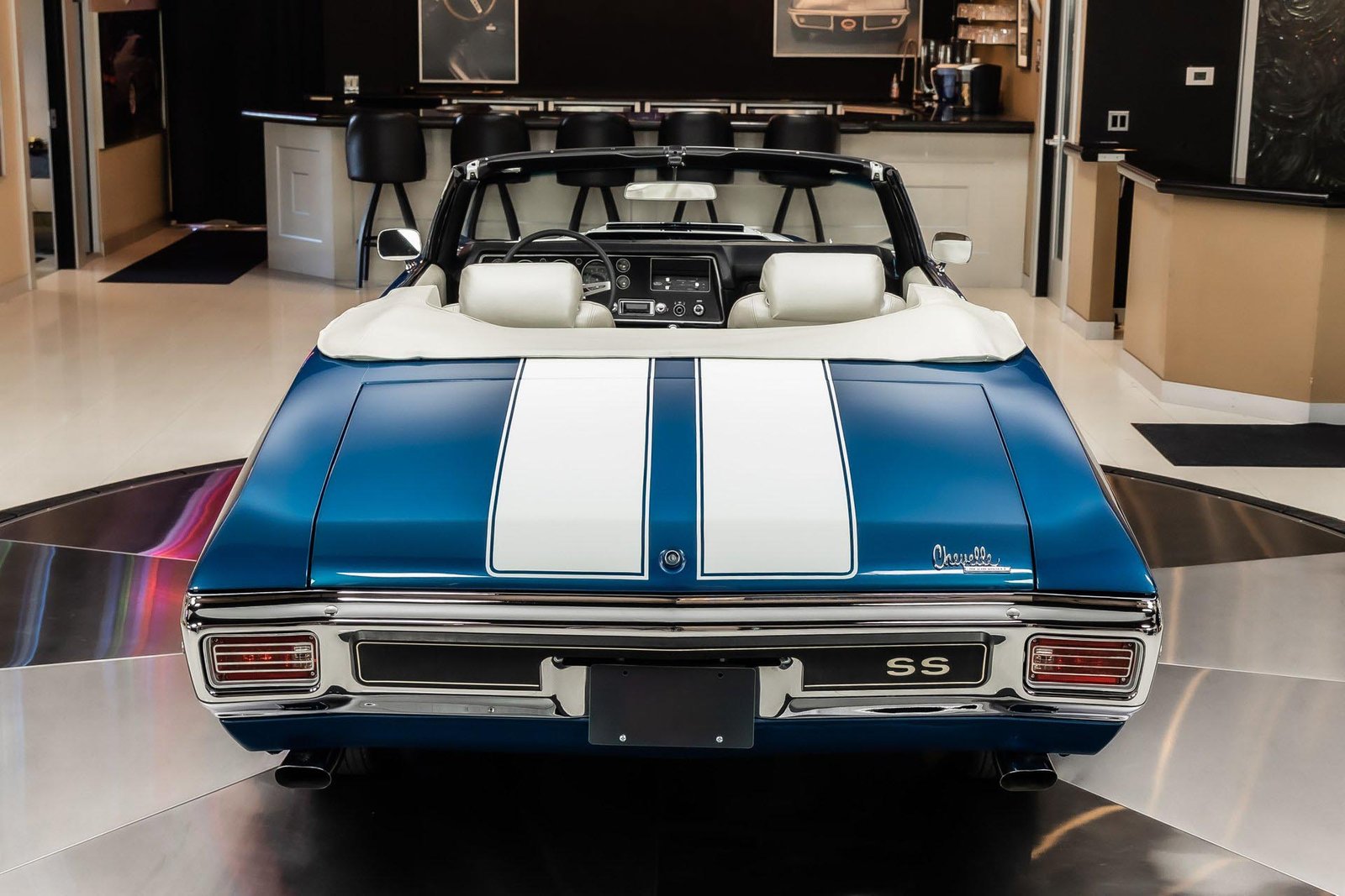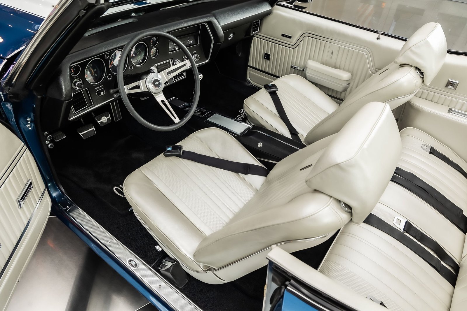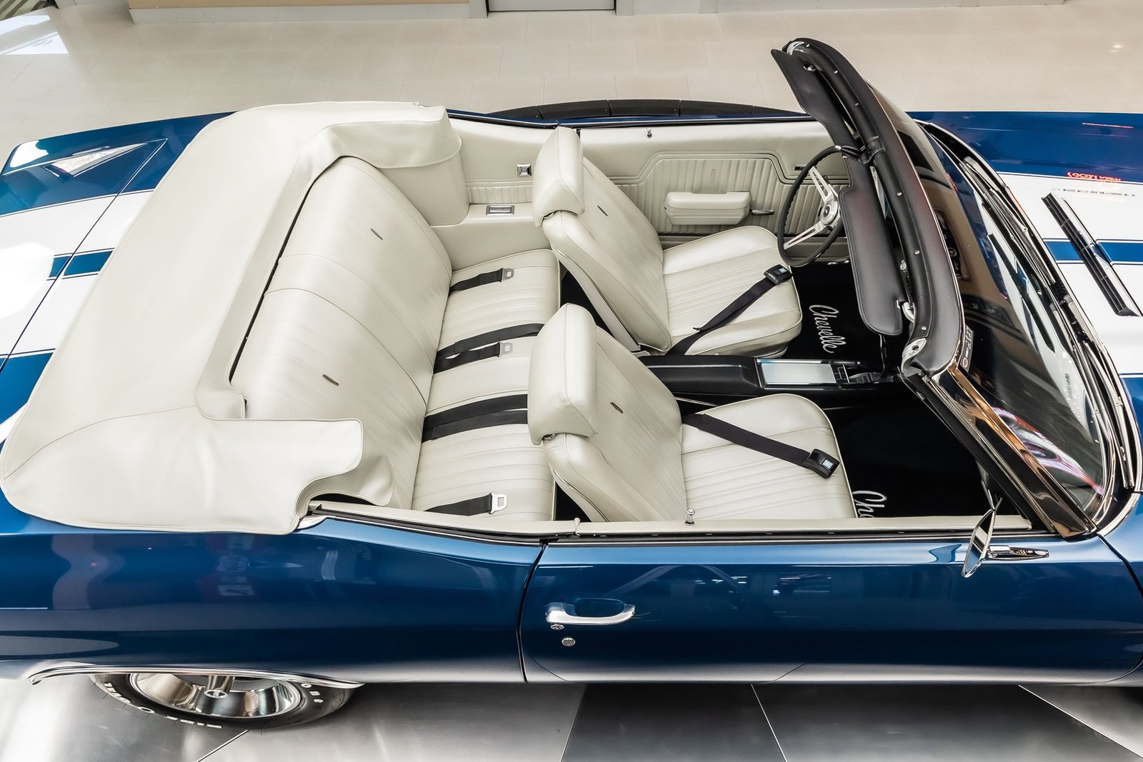 This example has been the recipient of a meticulous frame-off, rotisserie-style build completed over several years, resulting in a car that balances show-quality presentation with strong road manners. Finished in Fathom Blue with white center stripes and a white power-operated convertible top, the exterior highlights the Chevelle’s iconic lines while maintaining a period-correct appearance that never goes out of style.
