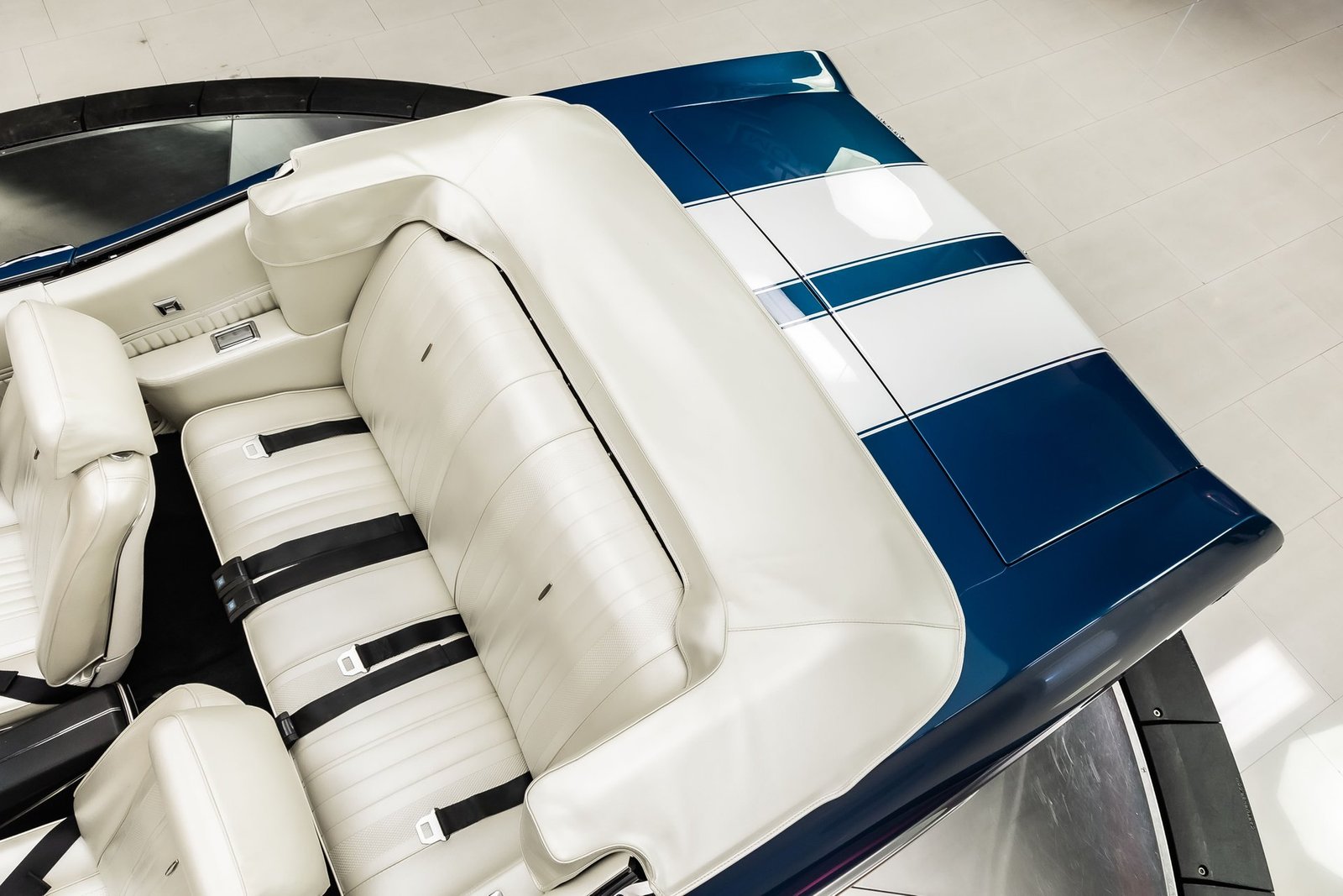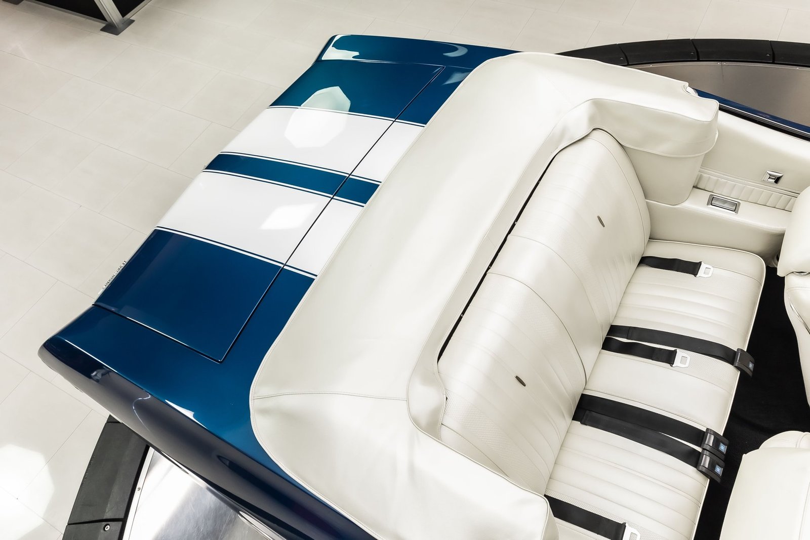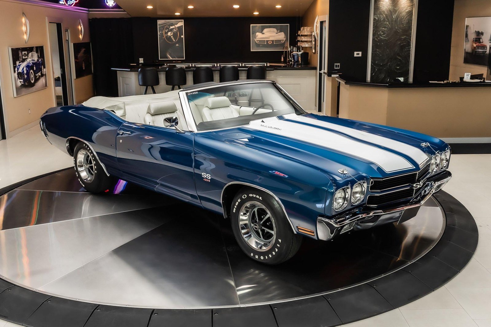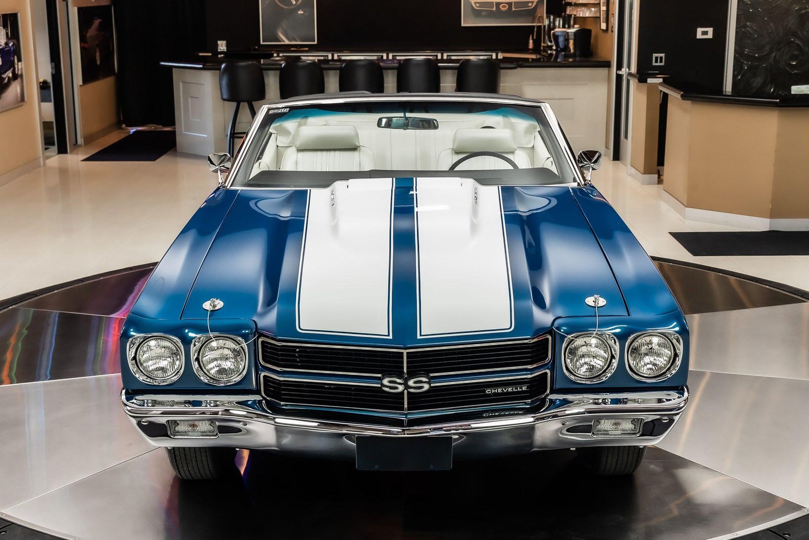 This example has been the recipient of a meticulous frame-off, rotisserie-style build completed over several years, resulting in a car that balances show-quality presentation with strong road manners. Finished in Fathom Blue with white center stripes and a white power-operated convertible top, the exterior highlights the Chevelle’s iconic lines while maintaining a period-correct appearance that never goes out of style.