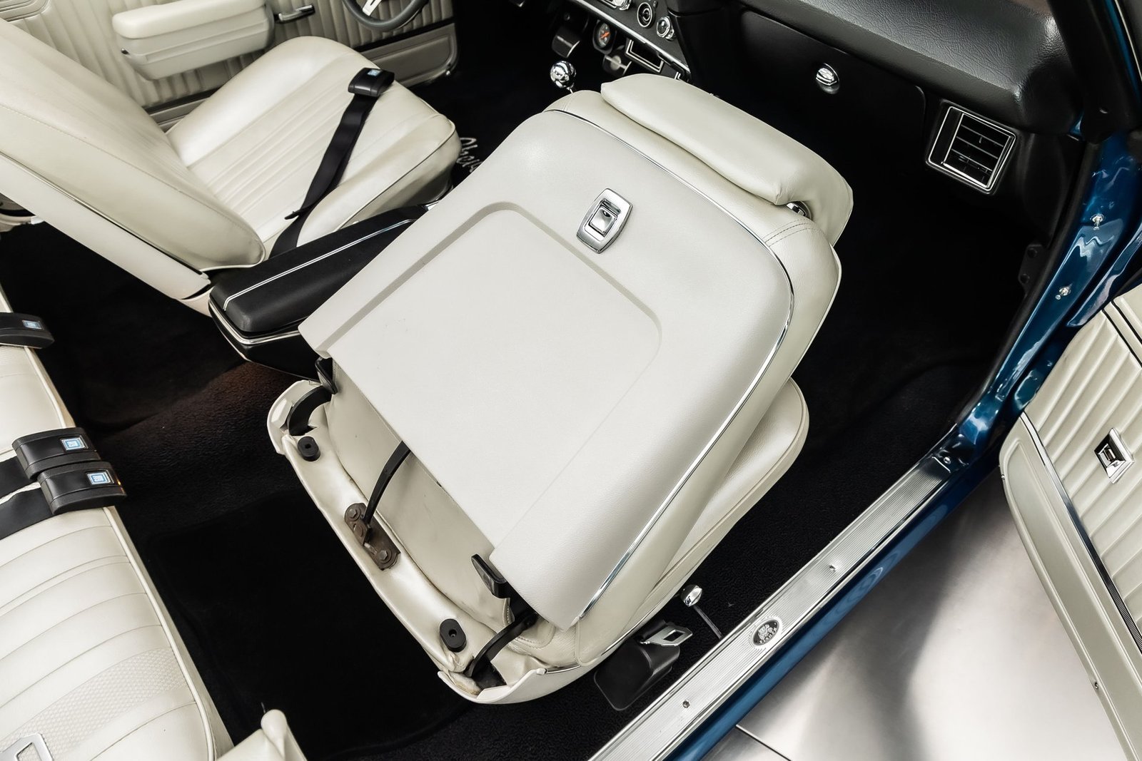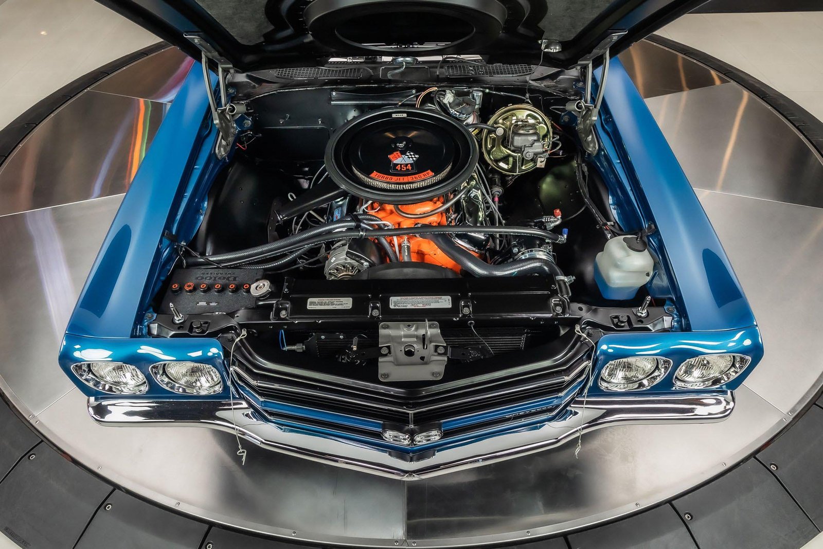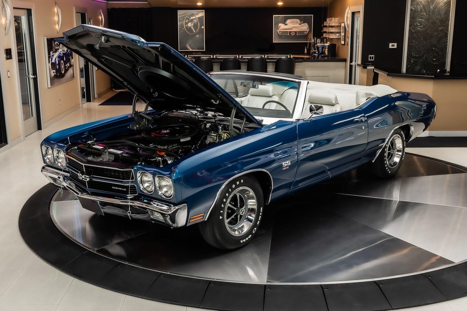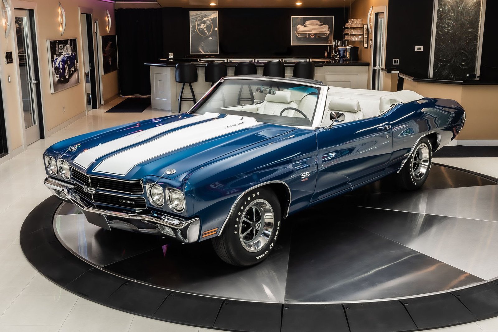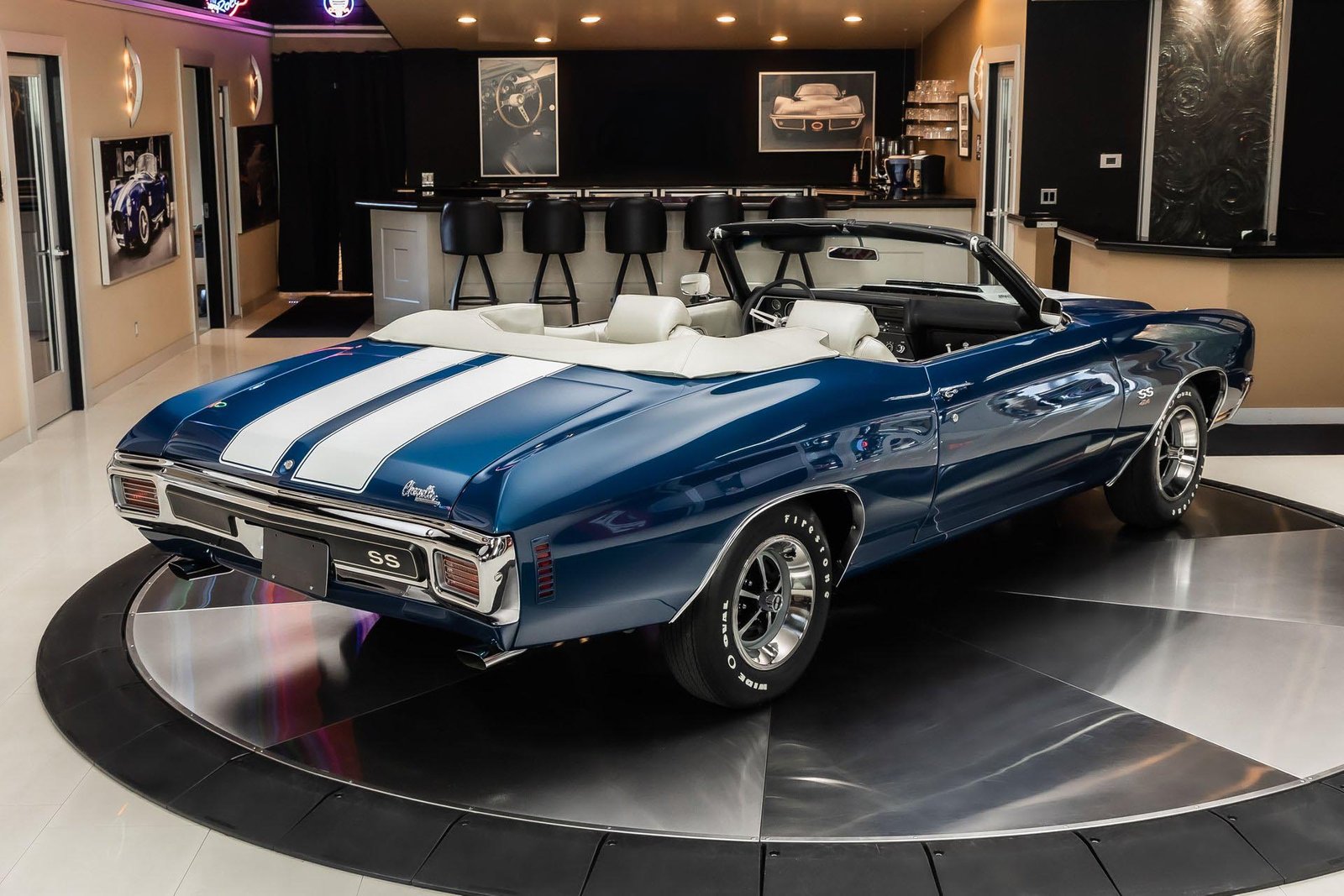 This example has been the recipient of a meticulous frame-off, rotisserie-style build completed over several years, resulting in a car that balances show-quality presentation with strong road manners. Finished in Fathom Blue with white center stripes and a white power-operated convertible top, the exterior highlights the Chevelle’s iconic lines while maintaining a period-correct appearance that never goes out of style.