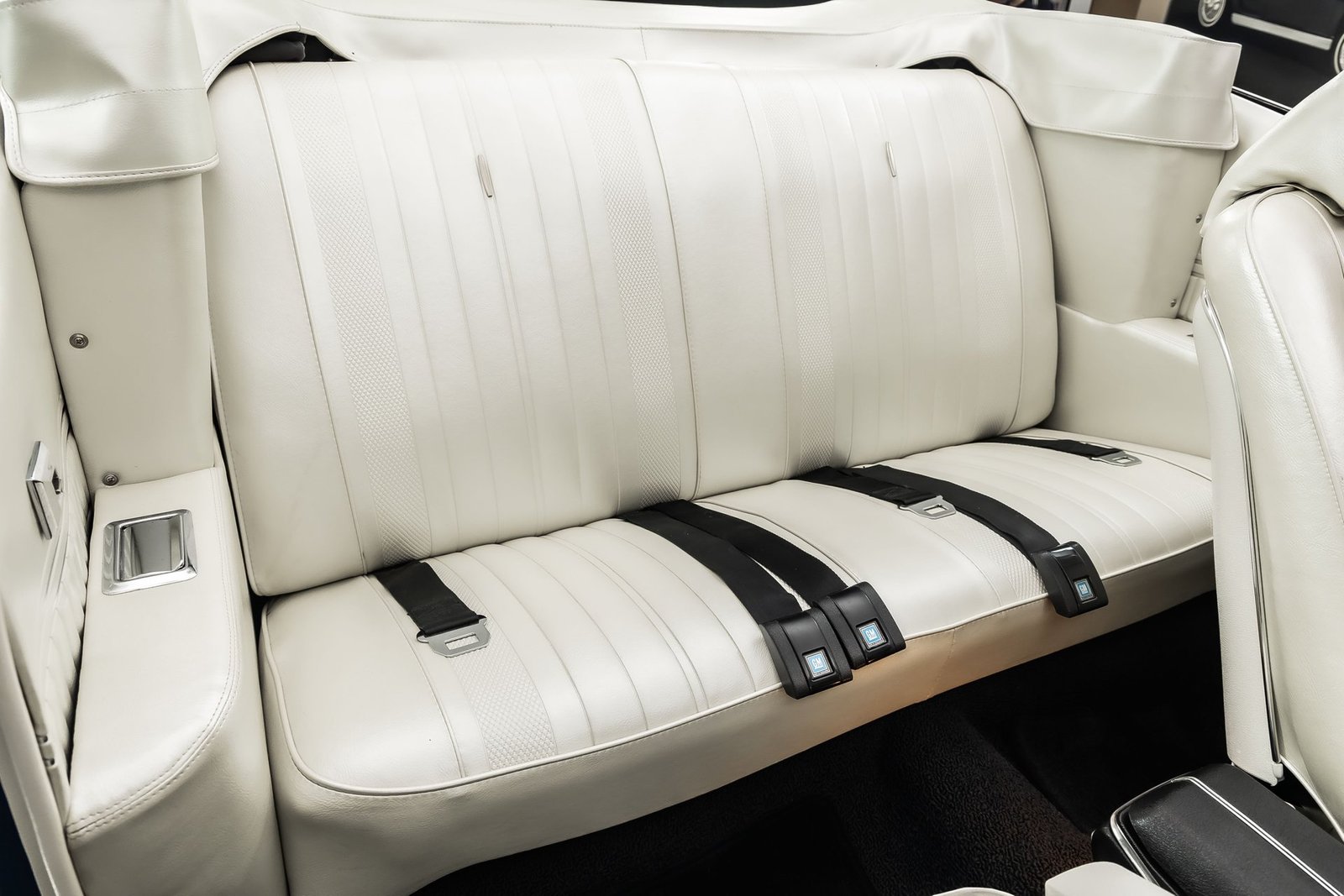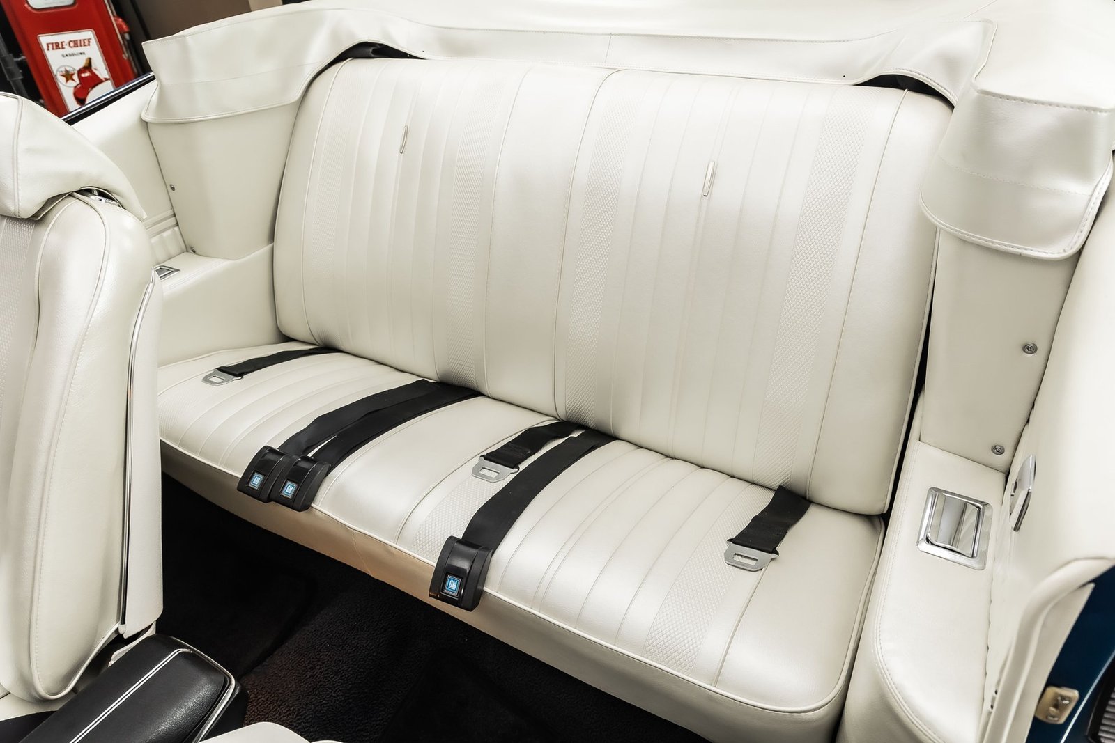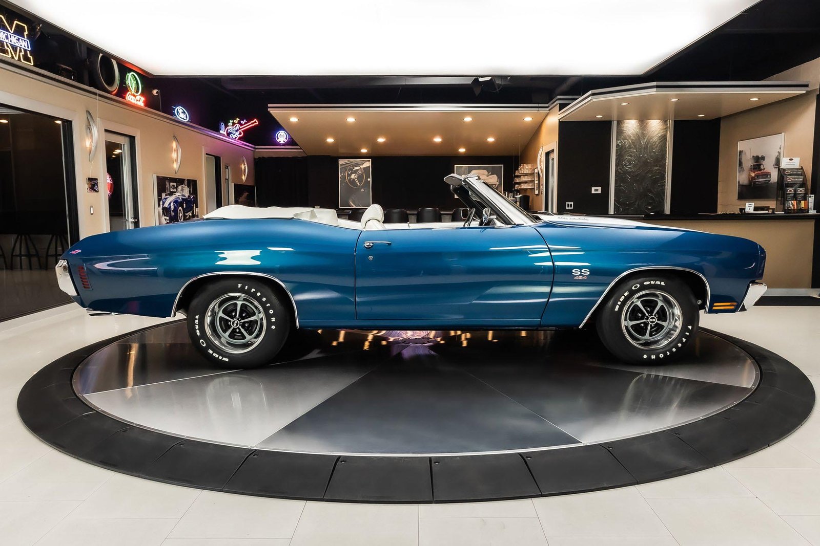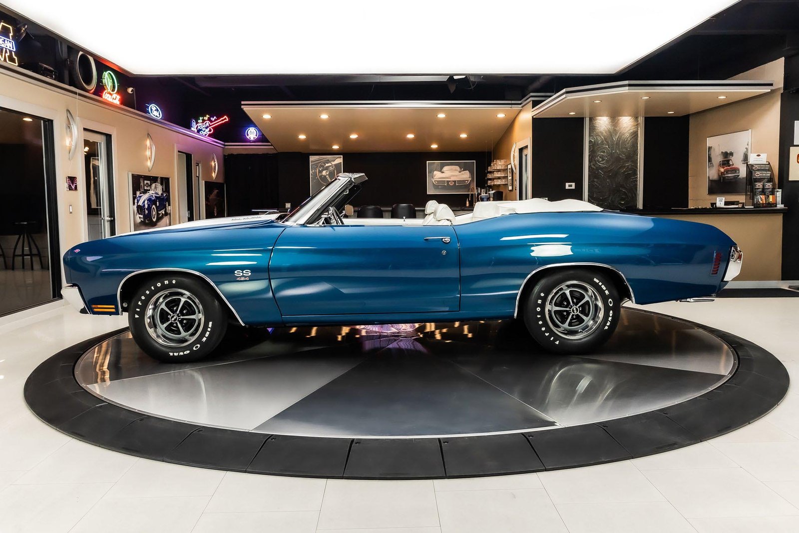 This example has been the recipient of a meticulous frame-off, rotisserie-style build completed over several years, resulting in a car that balances show-quality presentation with strong road manners. Finished in Fathom Blue with white center stripes and a white power-operated convertible top, the exterior highlights the Chevelle’s iconic lines while maintaining a period-correct appearance that never goes out of style.